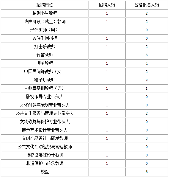 2.因无符合条件的报名人员,形体教师(男)、民族乐团指挥、影视编导专业带头人、文化创意与策划专业带头人、文物修复与保护专业带头人、展示艺术设计专业带头人、公共文化活动组织与管理教师、博物馆展陈设计教师、非遗保护与传承教师等9个岗位本次暂不开考。