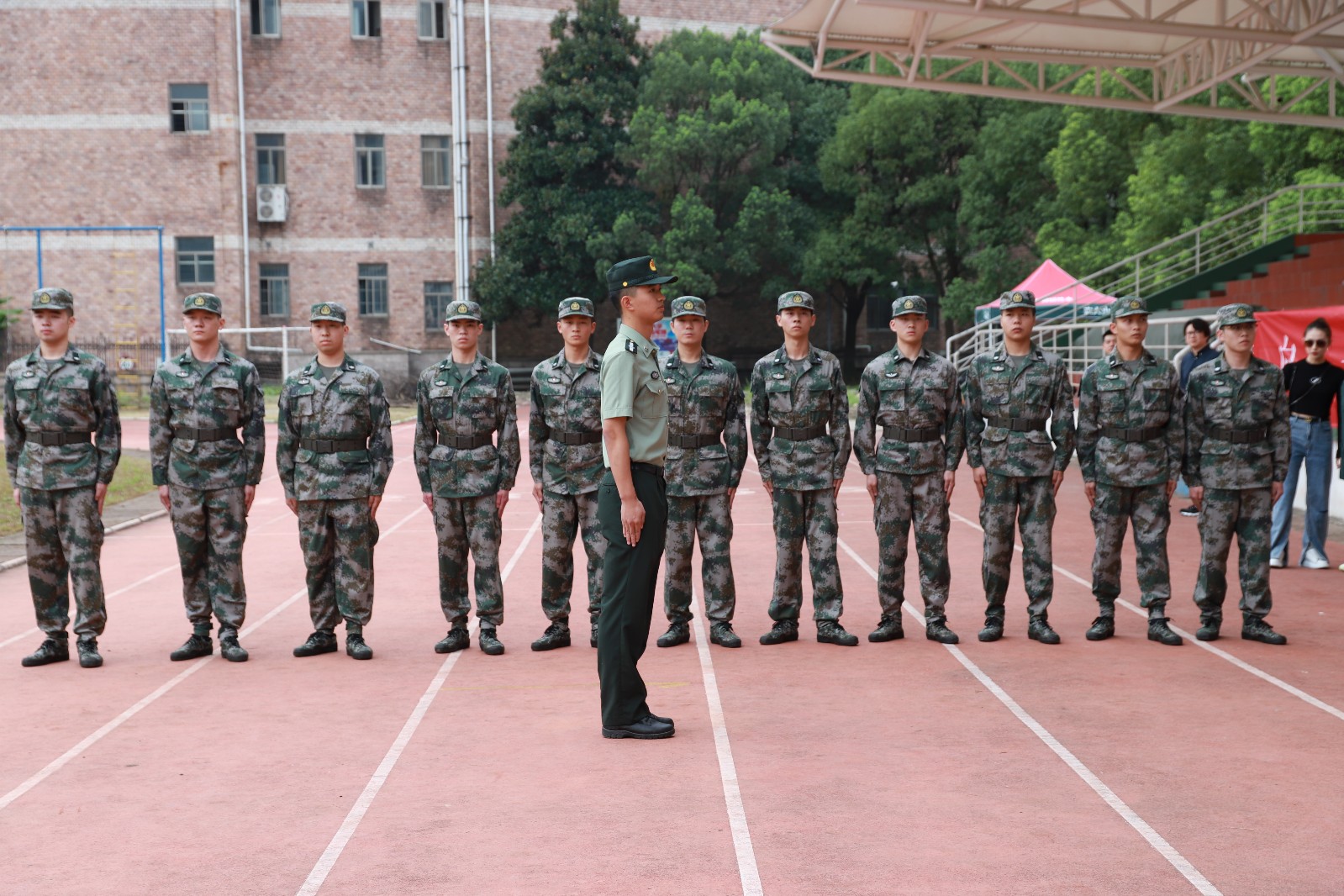 学工部副部长吴颖宣读学生军训团干部及教官名单。学工部副部长张志扬为军训团授旗。沈军甫、吴颖、张志扬、各系书记现场为全体教官颁发聘书。教官们现场进行队列展示。