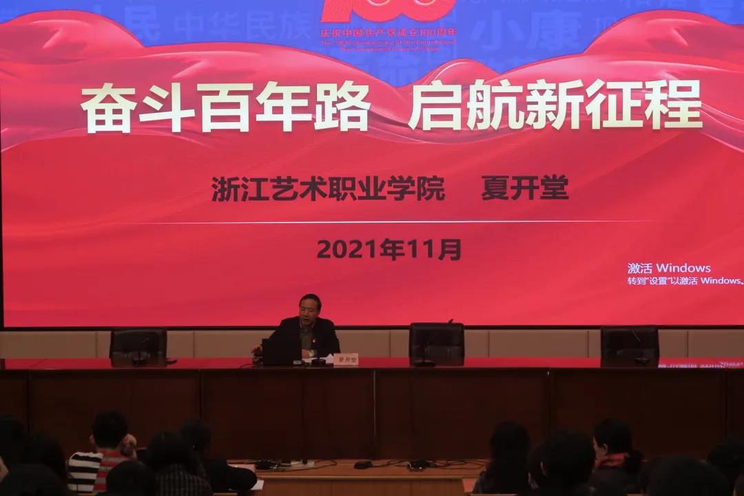 夏开堂以“奋斗百年路,启航新征程”为题,以时间为轴,从丰功伟绩、恢弘史诗;精神血脉、代代相传;以史为鉴、开创未来三方面展开,用简洁的图文、详实的数据,回顾一百年来中国共产党团结带领人民创造新民主主义革命的伟大成就、社会主义革命和建设的伟大成就、改革开放和社会主义现代化建设的伟大成就、新时代中国特色社会主义的伟大成就,中华民族从站起来、富起来到强起来的伟大飞跃。同时,深入阐释坚持真理、坚守理想,践行初心、担当使命,不怕牺牲、英勇斗争,对党忠诚、不负人民的伟大建党精神的深刻内涵和时代价值,以及在新征程上要牢牢坚持“九个必须”。他指出,“九个必须”揭示了过去我们为什么能够成功、未来我们怎样才能继续成功的深刻道理,这既是对建党百年来积累的宝贵经验的高度概括,又是对在新征程上勇往直前所作出的战略部署,进一步深化了对共产党执政规律、社会主义建设规律、人类社会发展规律的认识,必将激励我们在新征程上更加坚定、更加自觉地牢记初心使命、开创美好未来。希望党员和同学们树立正确的政治方向,筑牢理想信念,志存高远、脚踏实地,勇担时代重任,不负青春韶华。
