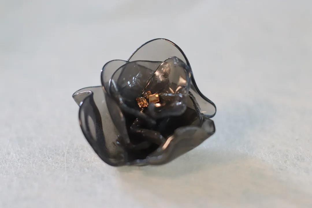 “谁家浴罢临妆女,爱把闲花插满头”花自古以来就是女子作为打扮的装饰品。在头饰花的设计上,融入了现代元素,经过特殊烧制的塑料加上钻石的点缀,“烟熏”出水墨肌理,使其更具时尚感。这样别致的毕业作品来自于2019级民传班的胡雯潇。