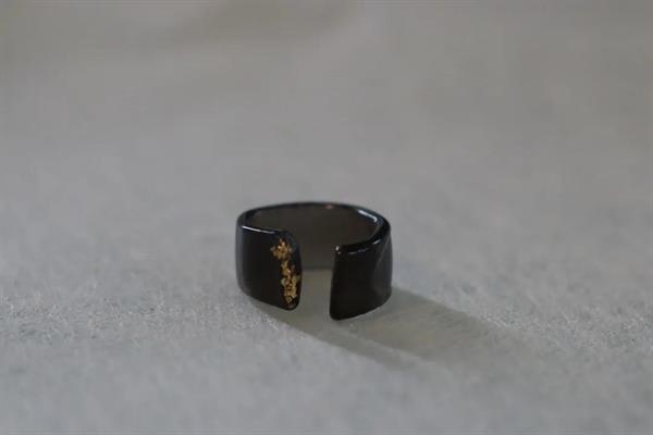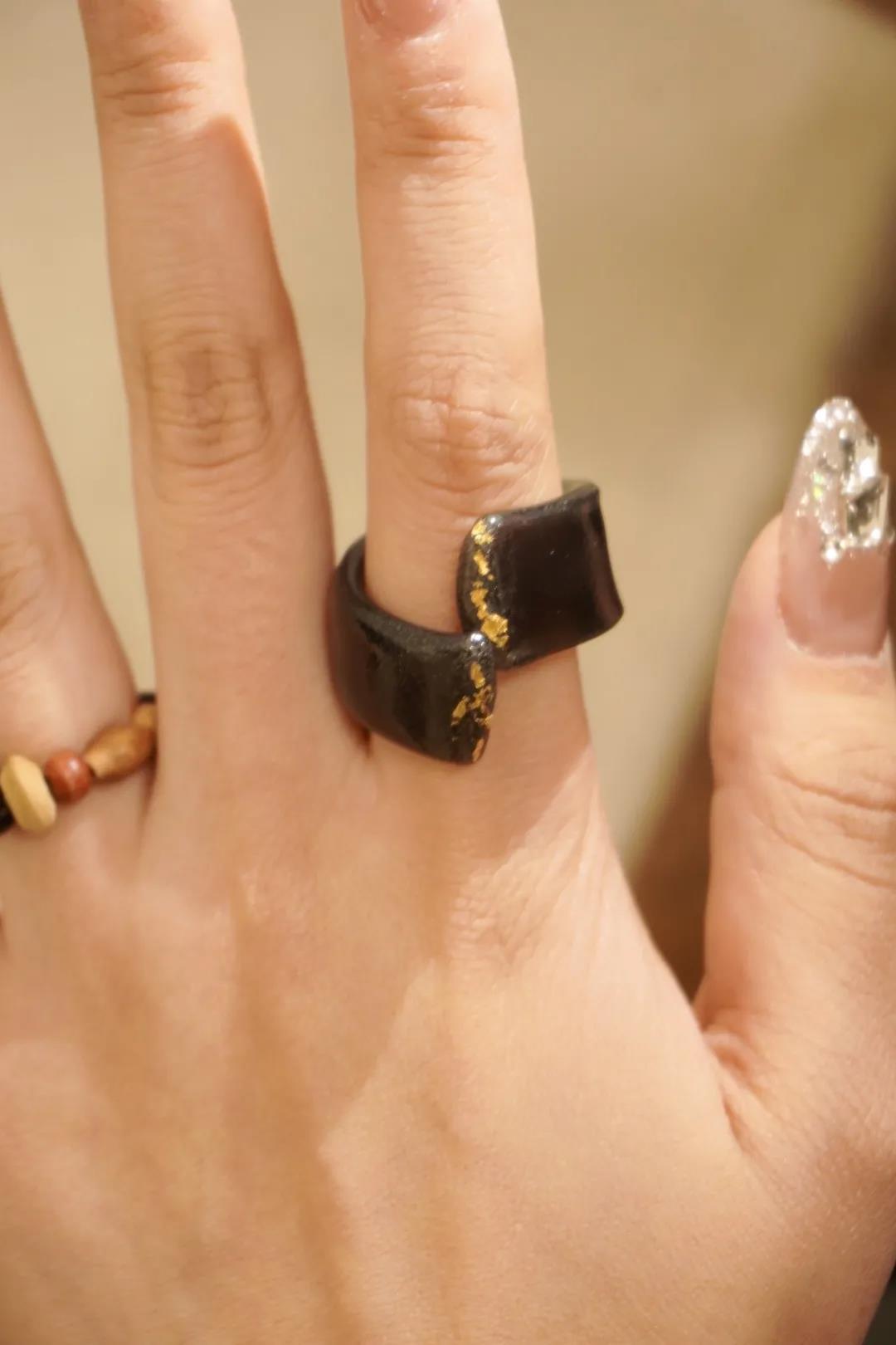 黑金色一直是时装设计师,乃至整个时尚界的宠儿。指环以黑色为主点缀金箔与珍珠,不失大气华丽。