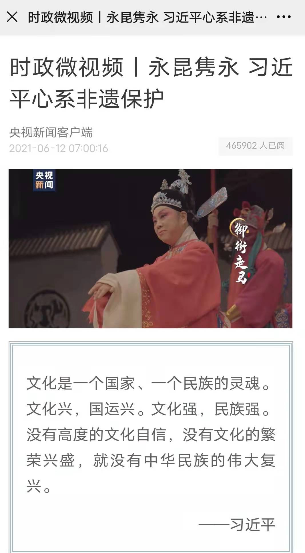 央视新闻客户端:时政微视频丨永昆隽永 习近平心系非遗保护