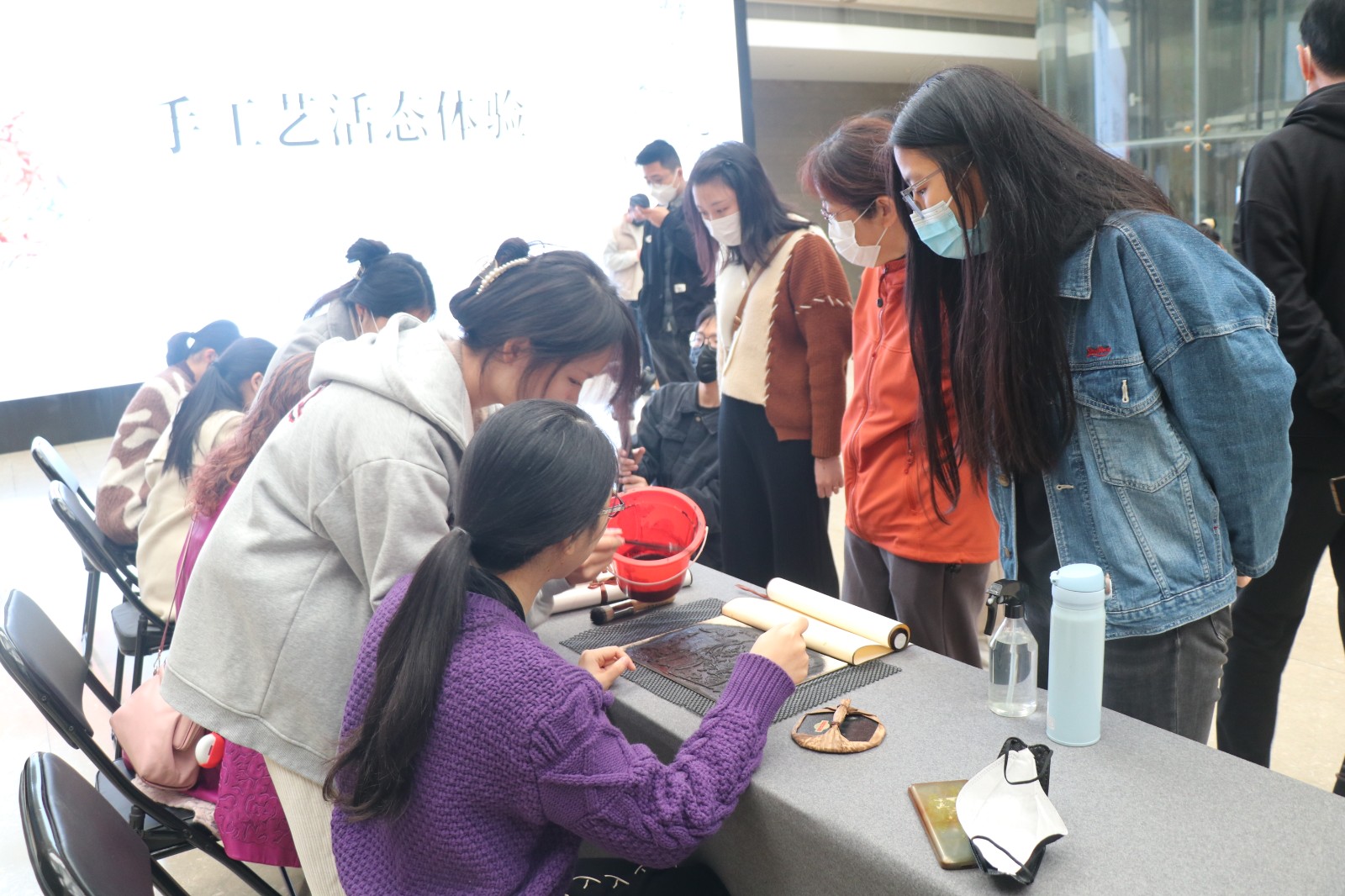 体验者们积极踊跃、依次有序体验做水印木刻,手工艺学院师生一对一、手把手指导。体验者们用心、大胆地创作,运用了更多色调让画面更厚实,让空白的宣纸变化出精彩的视觉效果。最终的成品画面丰富,独具韵味。富有趣味的体验活动,让体验者们久久不肯离去。
