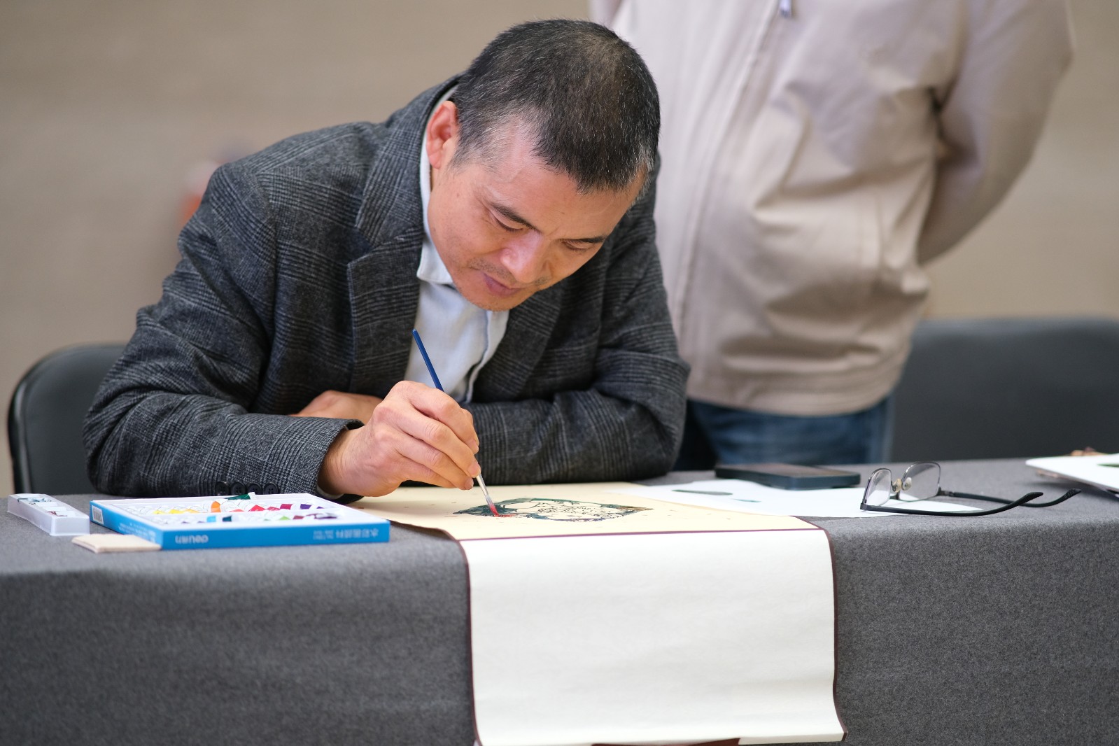 本次活动中,手工艺学院民族传统技艺专业教师高迅为观众揭开了水印木刻的神秘面纱,现场示范了印刷、手工上色等一系列制作流程。将年历对好位置,用镇尺压牢固。掀开年历,用毛笔蘸取黑色水墨涂抹在已刻好的木板上,再用圆刷刷匀版面上的水墨。覆上年历,用马莲在年历的背面施力印刷,在确保所有的图形印刷到位后揭开。现场观众看得全神贯注,颇有兴趣。