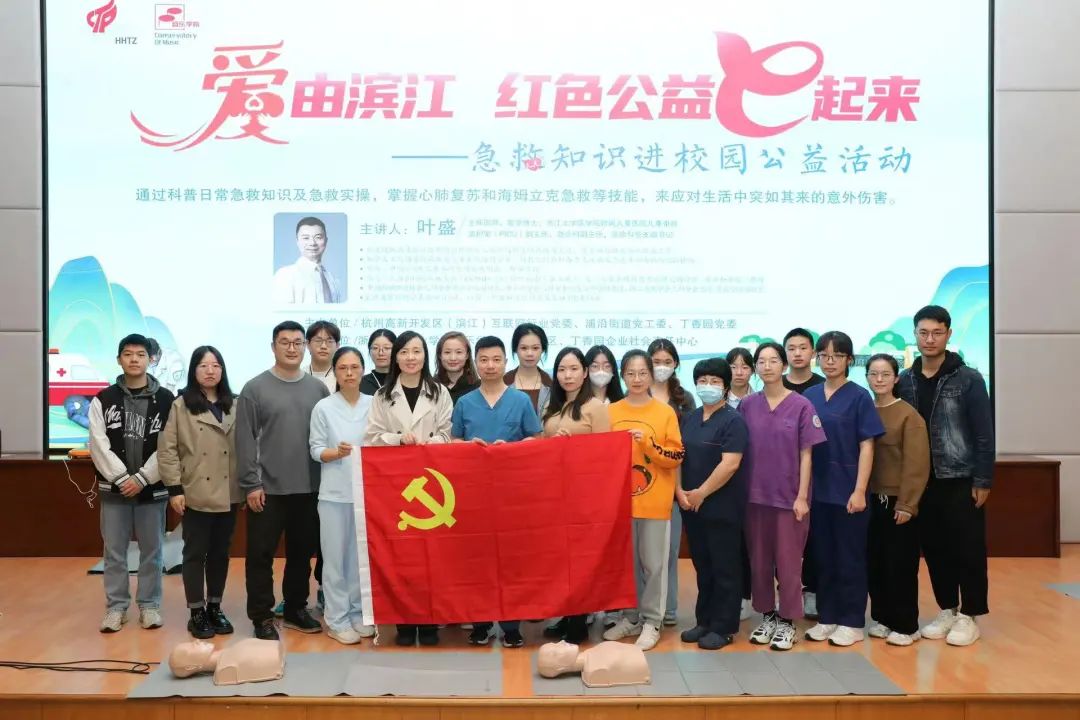 为普及应急救护知识和技能,提高全体师生自救互救能力,近日,“爱由滨江  红色公益e起来——急救知识进校园公益活动”在学校图信中心报告厅开展。活动由杭州高新开发区(滨江)互联网行业党委、浦沿街道党工委、丁香园党委主办,浙艺音乐学院、滨文社区、丁香园企业社会责任中心承办。相关单位志愿者、工作人员及音乐学院师生代表参加。音乐学院办公室主任叶婷婷主持。