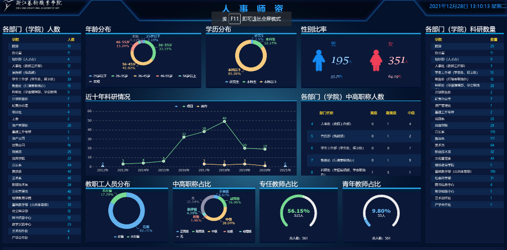 建立大数据应用平台,逐步开发采集中心、智能填报、校情分析、综合主题大屏、数据应用等功能。建成后的大数据应用平台将实现全校师生个人数据的查询、教师考核的的智能填报、审计数据与思政数据的自助上报与确认等功能。改变了原来需要数月时间进行数据统计分析的人工工作方式,利用大数据自动统计、分析,形成校情总览、人事师资、科研信息、审计数据监控、图书借阅信息、师生一件事等可视化分析大屏,让管理更加高效。