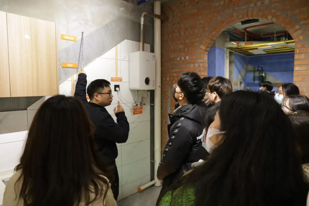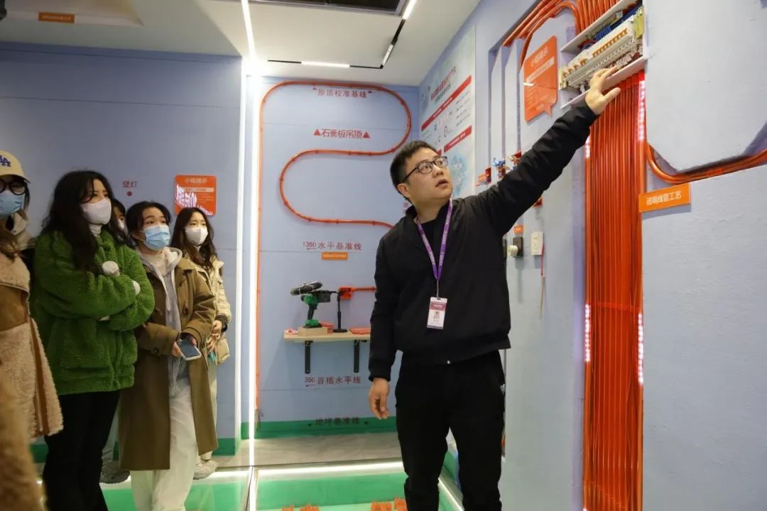 铭品装饰工程师金志强为同学们讲解了电工、木工、泥工、水工和油漆工等工种和相关工艺流程。置身模拟真实施工现场的展厅,让同学们深刻体会到艺术与技术是相融共生的。