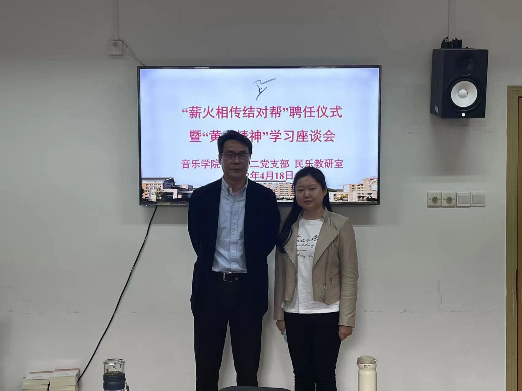 4月18日,音乐学院教工第二党支部、民乐教研室在3101党员之家举行“薪火相传结对帮”聘任仪式暨“黄龙精神”交流分享。吴樟华、朱学富、陆曙鸣、马崊等4位正高职称党员教师受聘结对4名青年教师,并作“黄龙精神”与教书育人心得分享。支部党员、民乐教研室全体教师参加。