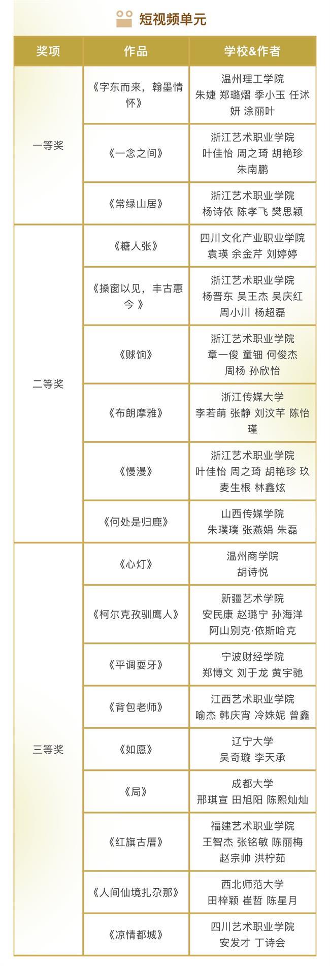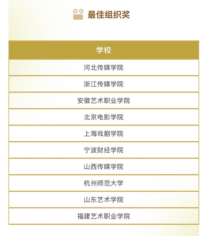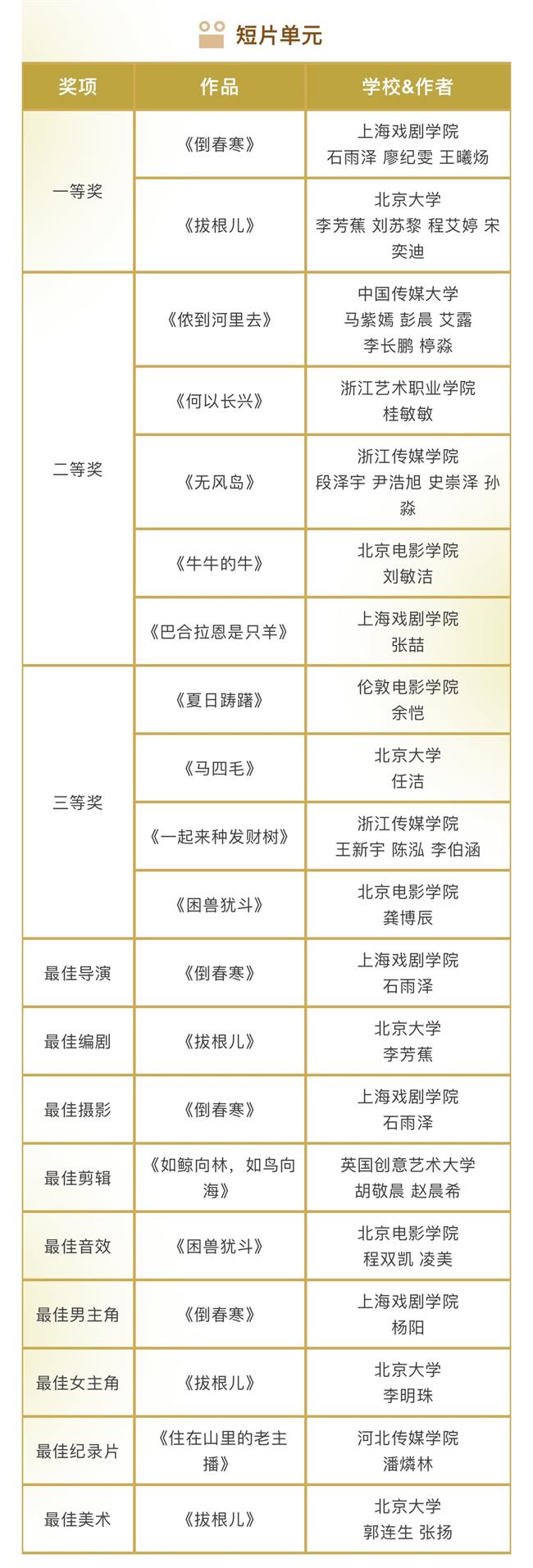 本届金鹄青年电影节共收到来自清华大学、北京电影学院等200所国内外院校的1296件参赛作品,最终有285部作品成功入围。最终,由评委会评选出5个单元的77个奖项以及10个最佳组织单位。具体获奖名单如下: