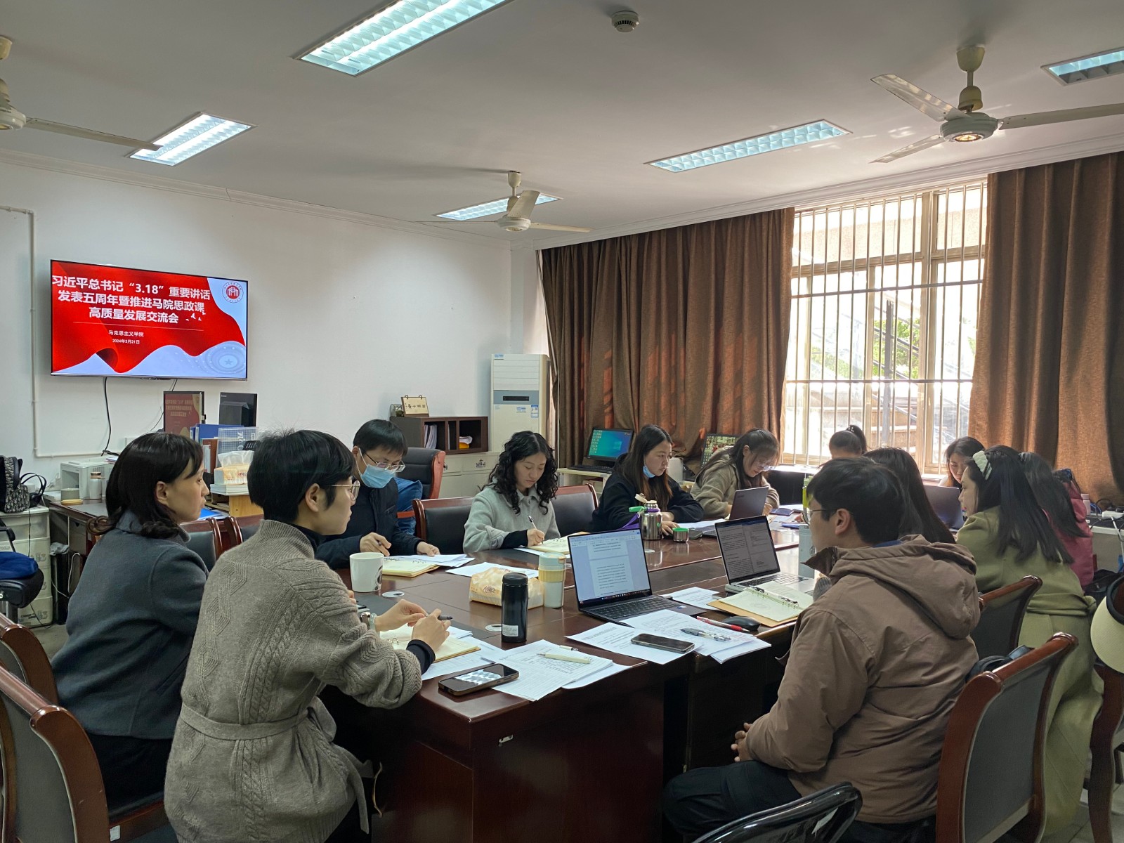 党的十八大以来,以习近平同志为核心的党中央高度重视学校思政课建设。2019年3月18日,习近平总书记亲自主持召开学校思想政治理论课教师座谈会并发表重要讲话。为系统总结我校思政课建设的成果和经验,深入推进新时代思政课高质量发展,3月21日,马克思主义学院召开习近平总书记“3.18”重要讲话发表五周年暨推进马院思政课高质量发展交流会,马院全体教职工参加会议。